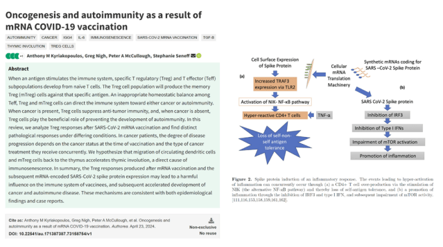 On 23 April, a pre-print paper (not yet peer-reviewed) was published in the journal Authorea that reviewed oncogenesis and autoimmunity caused by mRNA injections. It found that repeated mRNA injections reduce immune surveillance for cancer while at the same time inducing autoimmunity.