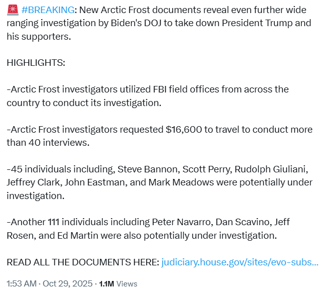 “New Arctic Frost documents reveal even further wide-ranging investigation by criminal Biden’s DOJ to take down President Trump and his supporters,” the Republican-run Judiciary Committee announced in a post on the social media platform X.