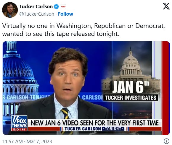 WATCH: Tucker Carlson on X: “Virtually no one in Washington, Republican or Democrat, wanted to see this tape released tonight. https://t.co/YfpvaIZTbn” / X