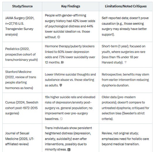 Meta-analyses (e.g., Cornell University's 2023 review of 55 studies) conclude transitions improve well-being for most, but regret/detransition occurs in 1-2% (often due to external pressures like discrimination, not inherent flaws).